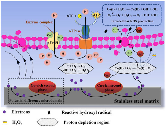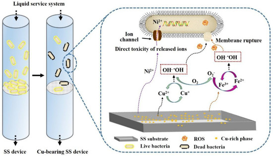Schematic illustration of the bacteria-killing process of Cu-bearing stainless steel [84].