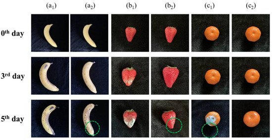 Photos of fruits stored at room temperature over several days: (a) banana; (b) strawberry; (c) sugared orange. Subscripts: (1) on 304 plate; (2) on 304-Cu plate [74].