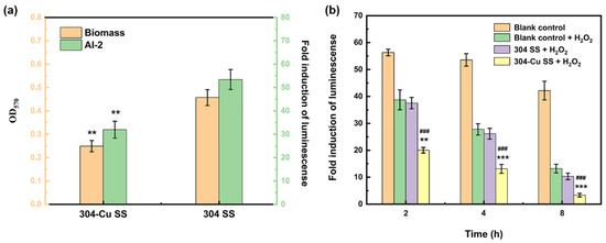 (a) Biomass attached to the surfaces of antibacterial 304-Cu and ordinary 304 stainless steels and the corresponding AI-2 signal expression levels. * Indicates significant difference between 304-Cu and 304 (* p < 0.05, ** p < 0.01, *** p < 0.001). (b) Changes in AI-2 signal activity under different treatments. All data represent the mean ± standard deviation of three independent experiments. * Indicates significant difference between 304-Cu SS + H2O2 group and blank control + H2O2 group (* p < 0.05, ** p < 0.01, *** p < 0.001); # indicates significant difference between 304-Cu SS + H2O2 group and 304 SS + H2O2 group (# p < 0.05, ## p < 0.01, ### p < 0.001) [79].