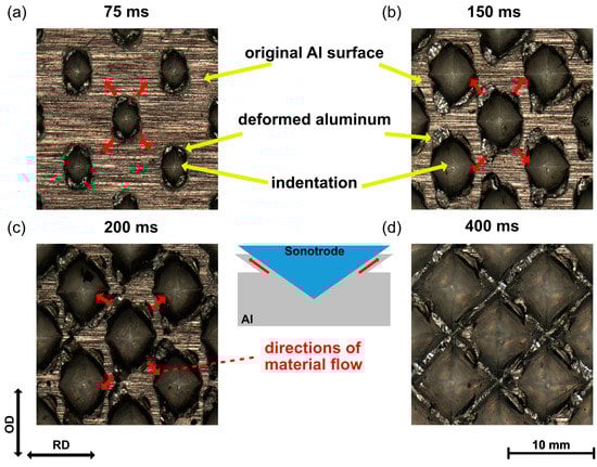 The appearance of the Al surface at different welding times was observed using a ZEISS Smartzoom 5 OM. Figure 2 shows the evolution of the indentation. At the initial phase of the welding process, the original Al surface with rolling marks was still observed, and the indentation appeared to be relatively small in rhombic shape. It can be seen that the plastic deformation started in the contact area under the sonotrode tip. As the welding process proceeded, the indentation gradually expanded, and the deformed Al flowed into the valley areas of the sonotrode tip. The directions of material flow are indicated by the red arrows in Figure 2. As can be seen, these directions tended to the OD because of the severe shear deformation. When the welding time reached 400 ms, the original Al surface was almost removed and the Al crests between indentation became sharp, which was fit to the outline of the sonotrode tips. Because there was no space for the deformed Al to flow in, no significant change was observed with further increases in welding time.