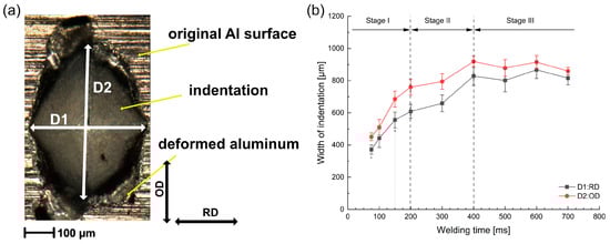 To quantitatively analyze the indentation on the Al surface, the widths of indentation D1 along the RD and D2 along the OD were measured, as illustrated in Figure 3a. The widths of the indentation are plotted against the welding time in Figure 3b. The evolution of indentation showed a similar tendency in both directions. However, the width D2 was constantly larger than D1 during USMW, which was caused by the tendency as a result of the vibration in the OD.