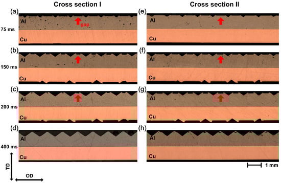 To evaluate the compaction behavior in the vertical direction, two cross-sections parallel to the OD were prepared. As shown in Figure 1e, cross-section I was close to the edge of the plastically deformed area, while cross-section II was in the middle of the weld zone. Figure 4 shows the optical micrographs of cross-sections I and II at different welding times. It can be noticed that the Al surface became more and more uneven in both cross-sections as the welding time increased. Owing to the stress concentration, a V-shaped valley formed at the contact area under the sonotrode tip. With additional shear stress caused by ultrasonic oscillation, the deformed Al was gradually driven into the free space between the sonotrode tip, resulting in a crest over the original Al surface. At short welding times, a gap between the two crests could be clearly obtained, as indicated by the red arrows in Figure 4. When the welding time reached 400 ms, the original Al surface was almost completely covered by the deformed Al and was not visible anymore.