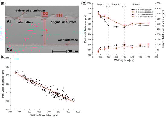 To identify the relationship between the deformation in the vertical and horizontal directions, the postweld thickness was correlated to the width of indentation, which is plotted in Figure 5c. It can be seen that the postweld thickness had a linear tendency to proportionally decrease with the width of indentation, which indicated that the specimen simultaneously deformed in the vertical and horizontal directions.