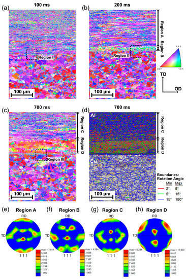 Inverse pole figures maps of the Al/Cu joint at different welding times: (a) 100 ms, (b) 200 ms, and (c) 700 ms. (d) Grain boundary character of (c); (e–h) {111} pole figure extracted from each region of the inverse pole figure maps.