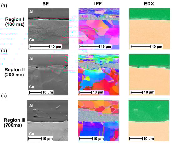 To examine the evolution of the grain structure and texture, EBSD analyses were performed at the weld interface of cross-section II. The approximate location was near the indentation, where the plastic strain locally concentrates according to Chen et al. [45]. The inverse pole figure (IPF) maps of the Al/Cu joints welded at 100 ms, 200 ms, and 700 ms are presented in Figure 7a–c, respectively. The initial microstructures of aluminum- and copper-based materials were characterized by the elongated grains along the rolling plane due to the mechanical deformation during cold rolling.