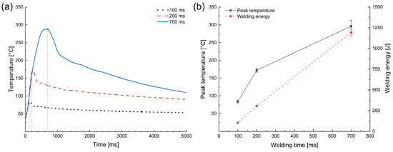 (a) Temperature–time profiles and (b) peak temperature and welding energy at different welding times.