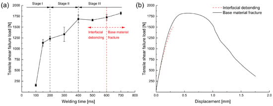 (a) Effect of welding time on the tensile shear failure load, and (b) load–displacement curves for interfacial debonding and base material fracture modes.