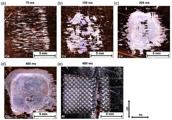 It can be seen that the morphology of the residual Al changed with increasing welding time. When the welding time was 75 ms, minimal residual Al remained on the Cu surface, and traces of Al oriented in line with the RD. Because no actual joint was formed at this time, this residual Al should have been the attached Al fragments shown in Figure 6. This suggests that the initial Al/Cu bonding mainly concentrated on the microasperities. As the welding duration increased, the microwelds grew in the OD, and large continuous welded areas were formed. However, the welded area propagated extremely inhomogeneously during the welding process, as can be seen in Figure 11b–d. Generally, most welded areas were located close to the edges of the weld zone, while some unbonded areas could still be observed at the center of the welding zone. This heterogeneous welded area could have been caused by the temperature, stress distribution, or surface morphology of the individual joining partners during USMW. When the welding time exceeded 600 ms, the bonding strength at the weld interface was stronger than the strength of the Al base material. Here, the failure crack propagated across the width of the aluminum, as illustrated in Figure 11e. Owing to the penetration of the sonotrode, extensive plastic deformation occurred at the aluminum surface and resulted in material thinning, which reduced the failure load of the Al base material.