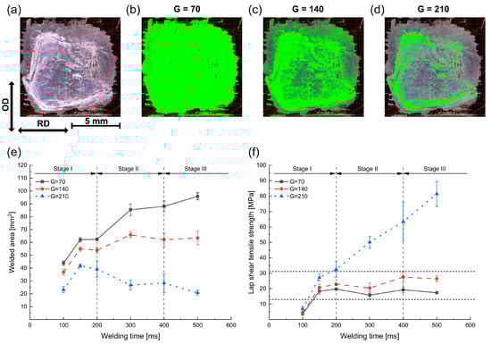 (a) Fracture surface of Al/Cu joints at 500 ms: the welded area as measured from the image processing technique (b) G = 70, (c) G = 140, and (d) G = 210. Variation in (e) welded area and (f) lap shear tensile strength with welding time.