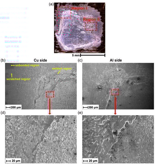 SEM was used to reveal more detail on the fracture surfaces, as shown in Figure 13a. Figure 13b,c show the higher magnification SEM images for Region I from the copper and aluminum sides, respectively. It can be seen that the fracture surface generally consisted of three different regions: unbonded region, scratched region, and welded region. In the unbonded region, some flat-looking type areas with the rolling marks of the base materials were observed. The scratched region mainly localized at the edges of the weld zone, and some attached aluminum debris was found here. Figure 13d,e show the magnified area of the box indicated in Figure 13b,c. Typical cleavage planes, shear ridges, and fracture dimples were observed in the welded region, revealing that a ductile–brittle hybrid fracture occurred in the tensile shear test. This may have been caused by the inhomogeneous temperature and stress distribution at the weld interface.