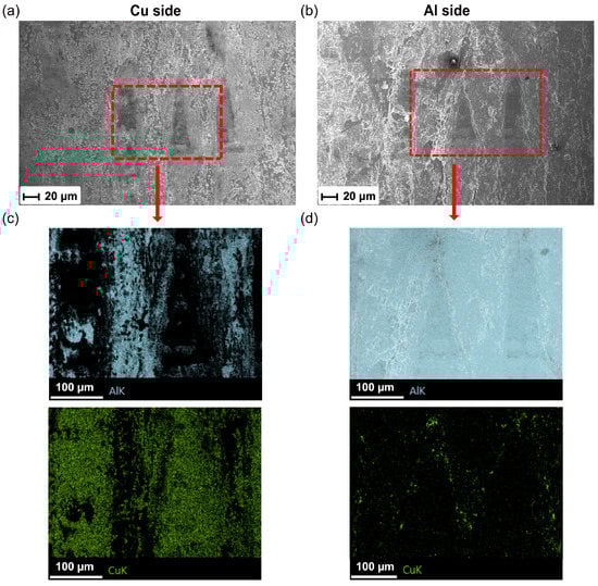 Furthermore, Figure 14 shows the higher-magnification SEM images for Region II in Figure 13a. Few unbonded regions were clearly observed and were surrounded by fracture dimples. To characterize the chemical composition, the EDX analysis was performed and is presented in Figure 14c,d. It can be seen that the Cu side exhibited Al in the welded region, while no Al was detected in the unbonded region. In contrast, minimal Cu was found on the Al side and was located at the border between unbonded region and welded region, which suggested that plastic deformation also occurred on the Cu side at the weld interface during USMW.