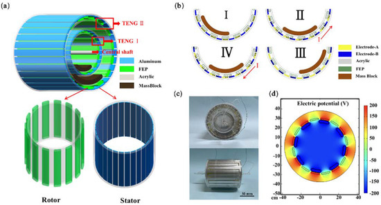 As shown in Figure 1(bI), in the initial state, if both the FEP and aluminum electrodes are not charged after soft contact, an electrostatic charge is generated due to triboelectrification. As the arched FEP film is in complete contact with aluminum electrode A, the negative charge on the surface of the FEP membrane and the positive charge on the surface of the aluminum electrode A should be equal and there is no current generation in the external circuit due to the charge balance. In Figure 1(bII), when TENG I is subjected to the external vibration energy, the mass block on the inner wall of the rotor swings to the right, and the arched FEP film is partially in contact with electrode B. Currently, the charge of electrode A flows into electrode B, while a counterclockwise current is generated in the external circuit. In Figure 1(bIII), as the mass block continues to swing so that the arched FEP films are in complete contact with electrode B, the negative charge on the arched FEP films is wholly neutralized with the positive charge on electrode B. In Figure 1(bIV), the mass block reaches the highest position and then swings to the left, making the arched FEP film come into contact with electrode A again [35]. The direction of the external current changes, and finally, the arched FEP films again returns to its initial position. Figure 1(bI–IV) describes the complete working process of a TENG unit. The mass block’s periodic swinging back and forth generates an alternating current in the external circuit. The potential distribution in two electrodes in a TENG unit is simulated by the COMSOL finite element method, as shown in Figure 1c, which can explain the principle of the current generation in the external circuit more clearly.