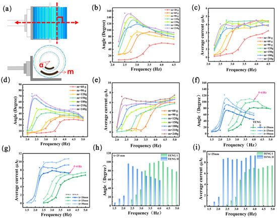 The effect of the mass block and excitation amplitude on the output of MC-TENG. (a) Relative position of the MC-TENG to the linear motor. (b–e) Variation in the mass block mass in each TENG unit concerning its swing angle and the average TENG current value. (f,g) The effect of different excitation amplitude conditions on the swing angle of the mass block in the two TENG units and the average current value. (h,i) Comparison of the outputs of the two TENG units at different frequencies.