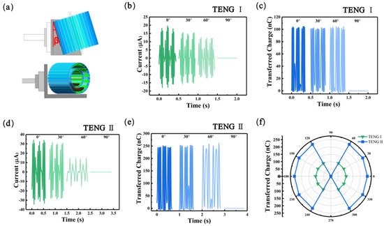 Electrical output performance of MC-TENG with different excitation directions. (a) The fixed position of MC-TENG on the linear motor. (b,c) The short-circuit current values and the corresponding transferred charges for different deflection angles of TENG I with a fixed amplitude of A = 25 mm and f = 4 Hz. (d,e) The short-circuit current values and the corresponding transferred charge at different deflection angles of TENG II with fixed amplitude of A = 25 mm and f = 2.25 Hz. (f) Transfer charge simulated by TENG from different angles.