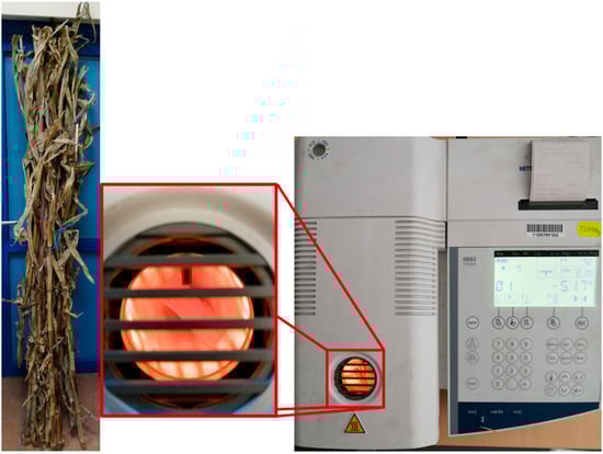 The material used in the study was corn harvested from the fields located in the Wielkopolska Province (west-central Poland) at the following geographical coordinates: 52°00′08.0″ N 17°46′46.9″ E. The corn stalks underwent seasoning for a period of 12 months after being harvested, by placing them indoors at room temperature. The moisture content of the stalks was determined by using a Mettler Toledo scale-dryer. The average moisture content from ten measurements was 9.01%, see Figure 1.