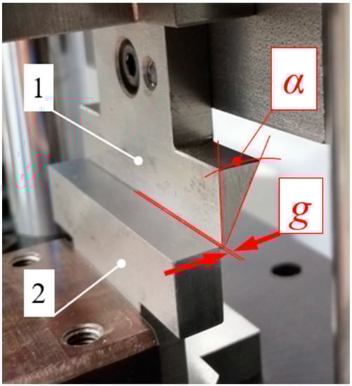 General view of the blade angle, α, and the distance g between the blade, 1, and the counter-blade, 2, of the testing station employed for cutting the corn stalks, with a general view of the blades employed in the study with the range of the blade-angle value α = 30–80°.