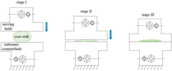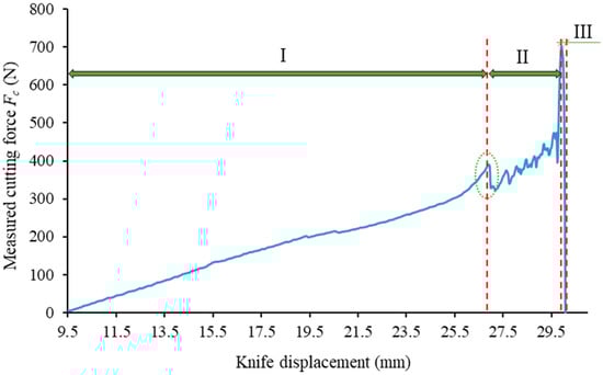 The cutting process can be divided into three stages (see Figure 4 and Figure 5). Figure 4 presents an example graph line for the recorded force value Fc in the course of the study of the corn-stalk cutting process. The first stage entails compression of the corn stalk by the blade. It shows a mild and proportional increase in force, along with the linear displacement of the knife. In the second stage, a sudden decrease in force is observed, by approx. a dozen Newtons (see Figure 4, marked with an ellipsis), followed by a sudden increase in the Fc value, achieving the maximum with a small displacement of the knife as it penetrates the previously compressed material of the corn stalk. The third and final stage is characterized by a sudden decrease in the force value, Fc, caused by the final separation of the corn stalk material (see Figure 4 and Figure 5).