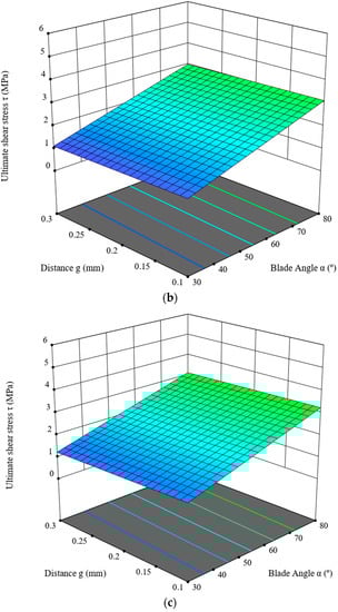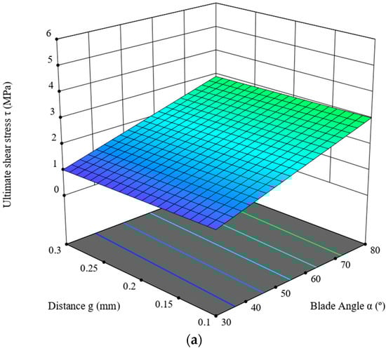 As follows from the data provided in Table 5, the highest value (F = 32.90, see Table 5) was measured for the experiment variable of the blade angle, α, which has the largest influence on the value of the cutting force. The second most important parameter is the interaction between the angle value, α, and distance, g; in this case, the value is F = 3.14.