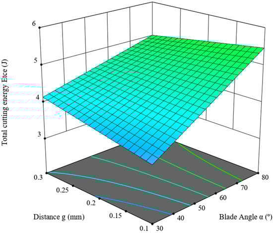 Total cutting energy, Etce, in the function of the blade angle, α, of the distance, g.