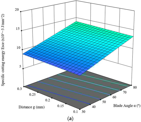 As follows from the data provided in Table 6, the highest value (F = 27.63, see Table 6) was measured for the experiment variable of the blade angle, α, which has the greatest influence on the value of the cutting force. The second most important parameter is the linear velocity of the blade, V; in this case, the value is F = 6.34. The cutting-force value decreases significantly, together with the decrease in the blade angle, α, and the increase in its linear velocity, V. A significant downward trend is observed for the value of Esce together with the decrease in the distance, g.