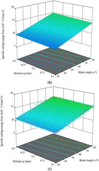 Specific cutting energy, Esce, in the function of the blade angle, α, of the distance, g, for velocity value (a) V = 1 mm/s, (b) V = 4 mm/s and (c) V = 8 mm/s.