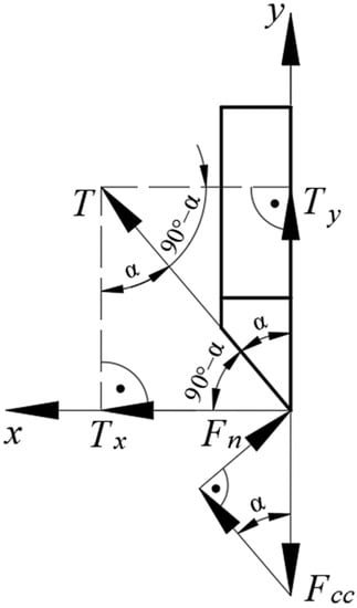 As a reminder, the cutting force measured in the course of the study is denoted as Fc (see Figure 4), whereas its corrected value according to the dependence (1) (Section 2.2) is denoted as Fcc. Based on the analyzed distribution of forces, the horizontal component, Tx, of the frictional force, T, (see Figure 11) was established according to the Formula (8):