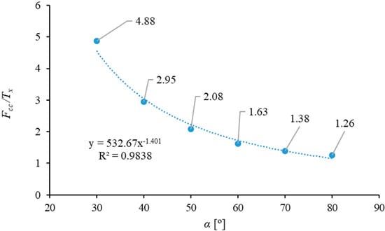 This was used to determine the value of the ratio of the cutting force, Fcc, and the horizontal frictional force component, Tx, Fcc/Tx. In Figure 12, the distribution of values of this ratio was presented in the function of the blade angle, α.