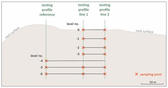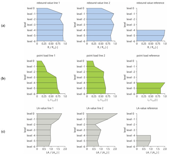- The reference measurements in levels −4 to −6 (high value grain of the quarry) show values that indicate a high-quality rock material as these are within the range of the reference value.