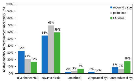 - the relative influence on the combined uncertainty u of the different testing methods shows a range of uvar,hor between 17% and 32% due to the geological variability in the horizontal direction; in comparison, the re-bound hammer method has the highest relative measurement uncertainty;