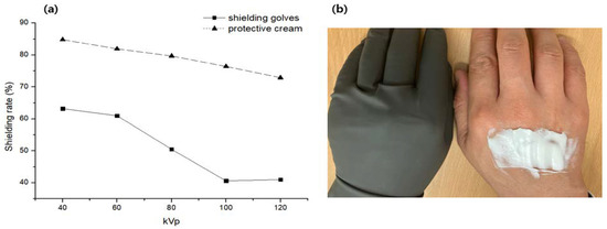 Figure 6. Comparison of shielding gloves and protective cream (30 wt%); (a) tungsten-based surgical shielding gloves (0.45 mm), and (b) barium sulfate-based protective cream (3.0 mm).