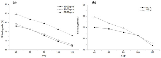 Figure 7. Changes in the shielding performance of the protective cream according to the speed (rpm) and temperature of the homo mixer: (a) shielding performance according to rpm, (b) shielding performance according to temperature.