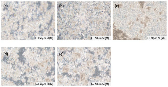 To review the process technology to increase the shielding performance in the manufacturing process of the protective cream, the shielding performance and dispersion of the cream were reviewed according to the temperature and speed (rpm) of the homo mixer during the mixing process. The results are shown in Figure 7. In the process of mixing the water-based organic carrier and the shielding material, air bubbles are removed, which is an important process that has a better effect as the rotation speed of the mixer increases because it affects the shielding performance. Furthermore, the temperature is not significantly affected by low or high temperatures. However, in low-dose shielding, a high temperature is effective, indicating a slight difference. Figure 8 shows an enlarged image of the smear, and it can be interpreted that there is a difference in the dispersion of the shielding material according to the mixing method. A comparison of Figure 8d,e reveals that Figure 8e has better dispersion.
