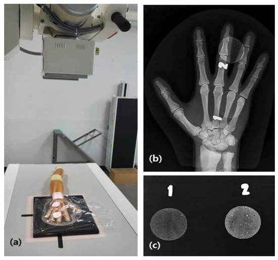 Figure 9. Radiation Imaging Analysis Using Human Hand Phantom: (a) filming scene to obtain an X-ray image of protective cream; (b) image of 1.0 mm protective cream on a phantom; (c) image showing different concentrations of 0.1 mm barium sulfate (1: 20 wt%, 2: 30 wt%).