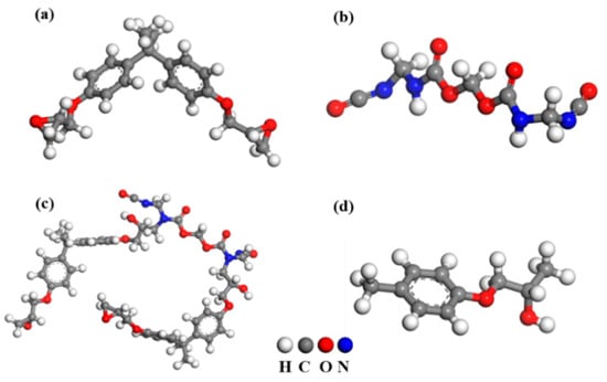 Optimized geometries of the monomer of (a) DGEBA, (b) MUPR, and (c) MUPR-modified DGEBA in MD simulation, and (d) DGEBA segment in DFT calculation [,,].