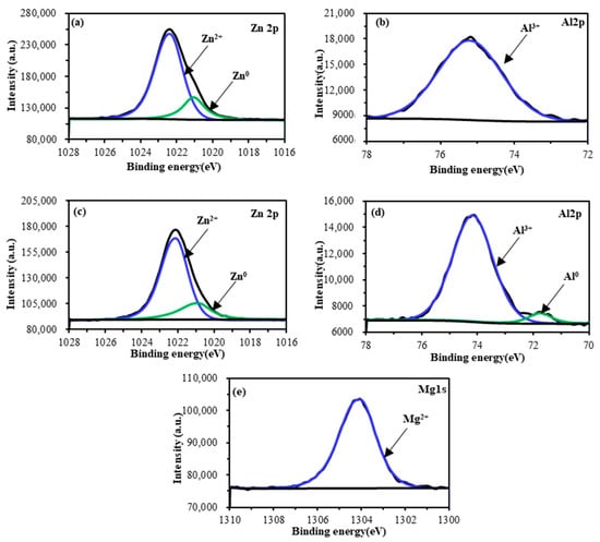 High resolution elemental spectra of (a) Zn 2p, (b) Al 2p of the Zn–Al coating, (c) Zn 2p, (d) Al 2p, and (e) Mg 1s of the Zn–Al–Mg coating.