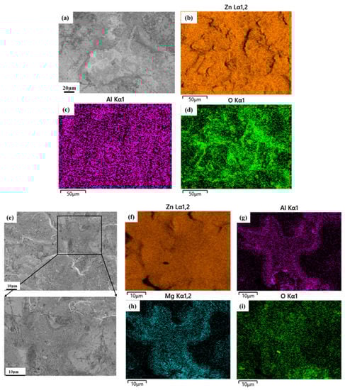 Figure 4 presents SEM and EDS maps of the Zn–Al and Zn–Al–Mg coatings. The Zn–Al coating is mainly composed of a massive microstructure (Figure 4a). As shown in Figure 4b–d, Zn and Al elements are uniformly distributed on the surface, while the higher concentration of O at the edge of the massive microstructure reveals the local enrichment of zinc oxide and aluminum oxide. The Zn–Al–Mg coating presents a mixed surface morphology of convex microstructure and dendritic microstructure (Figure 4e). EDS results show that Zn is uniformly distributed, while Al, Mg, and O are segregated in the dendritic microstructure area [], as shown in Figure 4f–i, which reflects the uneven distribution of aluminum oxide and magnesium oxide on the surface of the coating.