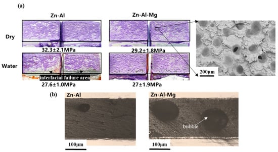 To evaluate the interfacial bonding performance between Zn–Al or Zn–Al–Mg galvanized steel and adhesive and the effect of water soak on the bonding performance, the lap-shear strengths were measured under both dry and water-soaked conditions. As shown in Figure 5, under dry conditions, the Zn–Al joint exhibits a higher adhesion strength (32.3 MPa) than the Zn–Al–Mg joint (29.2 MPa). Despite the difference in adhesion strengths, both joints show excellent interfacial bonding performance with cohesive fracture surfaces [,]. SEM observation of the fracture surface of the Zn–Al–Mg joint reveals a large number of holes, which are few in the fracture surface of the Zn–Al joint. The cross section of the adhesive joint (Figure 5b) reveals the presence of bubbles in the adhesive layer of Zn–Al–Mg joint. In contrast, fewer and smaller bubbles are observed in the adhesive layer of the Zn–Al joint. These bubbles weakened the mechanical properties of the adhesive and contributed to the lower bonding strength of the Zn–Al–Mg joint. The formation of bubbles suggests that the Zn–Al–Mg coating exhibited poor infiltration to the adhesive compared to the Zn–Al coating, and air could not be expelled outside the adhesive structure when the adhesive was in contact with the Zn–Al–Mg coating.