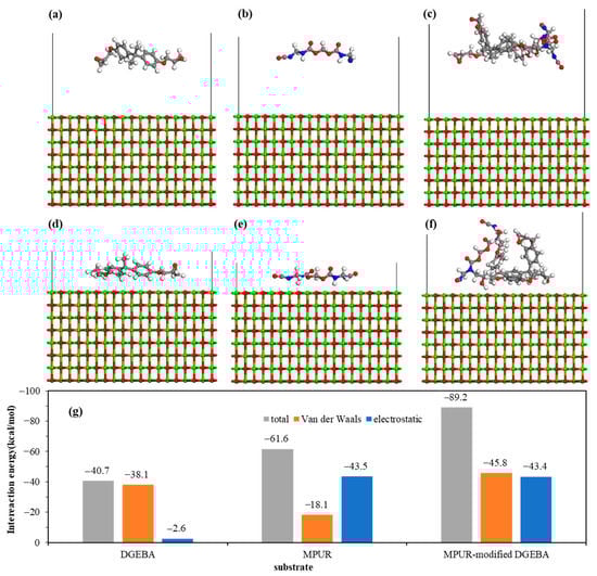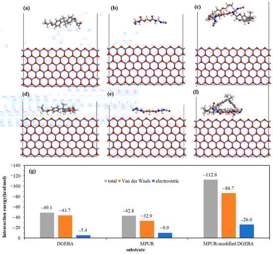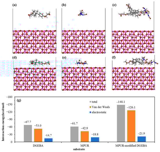 Molecular structure of Al2O3 (100) surface before and after interaction with (a,b) DGEBA, (c,d) MPUR, and (e,f) MPUR-modified DGEBA, and (g) their adsorption energy.