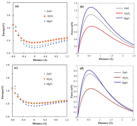 The fitting parameters obtained are shown in Table 2. As can be seen, the adhesion stresses of the DGEBA fragment on ZnO(10-10), Al2O3(100), and MgO(100) surfaces are 0.96 GPa, 0.68 GPa, and 1.14 GPa, respectively, which are in good agreement with the order of magnitude reported in the literature [,,]. The calculated adhesion stresses are two orders of magnitude larger than the actual joint strengths (Zn–Al: 32.3 MPa, Zn–Al–Mg: 29.2 MPa). This difference is attributed to the fact that the actual joint strength is affected by more complex factors, such as surface micro-nano structure, surface contaminants, internal stress, adhesive infiltration on the bonded surface, etc. [,,]. Moreover, it was found that cohesion failure occurred in both the experimental Zn–Al and Zn–Al–Mg joints, but the true value of the interfacial strength was not obtained. Therefore, the calculated adhesion stress is a theoretical value of the interfacial strength, which is greater than the actual joint strength. As previously analyzed, the calculated adhesion stress between the adhesive and MgO is significantly higher than that of the ZnO and Al2O3 models, which is a significant factor contributing to the excellent interfacial bonding performance of the Zn–Al–Mg joint.