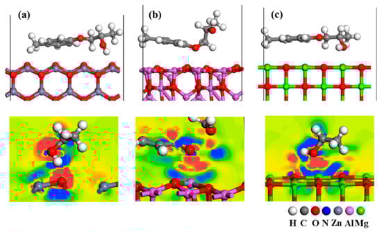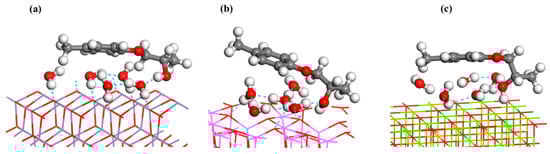 The simulation of this work was completed with Materials Studio 2018 software. The Henkel adhesive is a complex epoxy system consisting of epoxy monomers/oligomers, curing agents, and additives. According to the references [,,], the molecular structure of the Henkel adhesive was simplified into two main components: the epoxy monomer/oligomer (DGEBA) and the curing agent (MPUR). The optimized geometries of the monomers of DGEBA, MPUR, and the reaction product of MPUR and DGEBA (abbreviated as MUPR-modified DGEBA) are shown in Figure 2a–c. Surface models of ZnO (10-10), Al2O3 (100), and MgO (100) were constructed with similar number of atoms of 1296, 1200, and 1296, respectively. After adding a vacuum layer with a thickness of 35 Å on top of the oxide surfaces, the dimensions of the three models were 29.2 Å × 31.2 Å × 50.0 Å, 27.9 Å × 25.2 Å × 49.5 Å, and 26.8 Å × 26.8 Å × 49.7 Å for ZnO (10-10), Al2O3 (100), and MgO (100), respectively. All adhesive molecular chains were placed 10 Å above the surfaces to ensure a similar initial distance between the adhesive molecules and the oxide surfaces. The main chains were oriented parallel to the surface to maintain the same distance. All oxide–adhesive geometries were optimized and equilibrated for 500 ps with fixed oxide surface atoms at room temperature to ensure that the oxide–adhesive system reached equilibrium. The simulations were carried out under the NVT ensemble and the COMPASS force field []. The Andersen thermostat was used for temperature control. By using atom-based cutoff and Ewald methods, nonbonded van der Waals (vdW) and electrostatic interactions were considered, respectively.