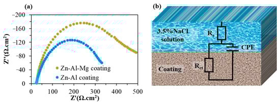 The immersion and diffusion of water molecules at the adhesive interface, as well as their corrosion on the coating surface, can accelerate the degradation of interfacial bonding performance []. To assess the corrosion resistance of Zn–Al and Zn–Al–Mg coatings, the electrochemical impedance spectroscopy (EIS) data were analyzed. Figure 11a shows the Nyquist plots of the two coatings, which take the form of a semicircle, indicating the occurrence of corrosion on the coating surfaces. The radius of the Nyquist curve is indicative of the corrosion resistance of the coating, with a larger radius corresponding to a lower corrosion rate and stronger corrosion resistance. The Nyquist curve radius of the Zn–Al–Mg coating is greater than that of the Zn–Al coating, demonstrating that it possesses stronger corrosion resistance. The equivalent circuit diagram of the EIS fitting is shown in Figure 11b, where Rs represents the resistance of the corrosive solution, Rct represents the resistance of charge transfer, and a constant phase element (CPE) replaced the capacitive element of coating to obtain the best fit []. The fitting data for the EIS equivalent circuit are provided in Table 3, where the Rs values for both samples are similar (with a relative error of no more than 5%). CPE-T and CPE-P represent the characteristic and index parameters of the CPE, respectively []. In comparison to the Zn–Al coating, the Zn–Al–Mg coating exhibits a lower CPE-T value and a higher Rct value, which further indicates its stronger corrosion resistance. As a result, it is relatively difficult for water molecules to cause corrosion at the adhesive interface of the Zn–Al–Mg coating compared to the Zn–Al coating, resulting in better interfacial bonding performance between the Zn–Al–Mg coating and the adhesive.