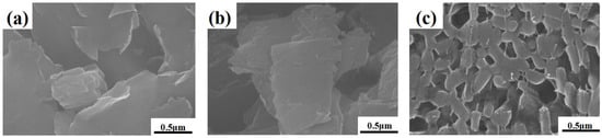 The organic modified OMMT was purchased from Zhejiang Feng Hong New Materials Factory. The surface topography of OMMT is shown in Figure 1a. OMMT has a lamellar structure, and the length of a single piece is more than 2 μm. The EGR (TXT-500) was purchased from Qingdao Yan Hai Carbon Materials Company. The surface topography of EGR is shown in Figure 1b. As can be seen from the Figure 1b, the surface of EGR is smooth. A single piece is about 1–2 μm in length and 0.5–1 μm in width. The PTFE dispersion was purchased from Macklin Biochemical Company in Shanghai, China. The surface topography of PTFE particles is shown in Figure 1c. PTFE is about 0.3–0.5 μm in length and approximately 0.2 μm in width. Polyvinyl alcohol (PVA) with a polymerization degree of 1700 and degree of hydrolysis of 88%, styrene (St), divinylbenzene (DVB) and benzoyl peroxide (BPO) were also purchased from Macklin Biochemical Company.