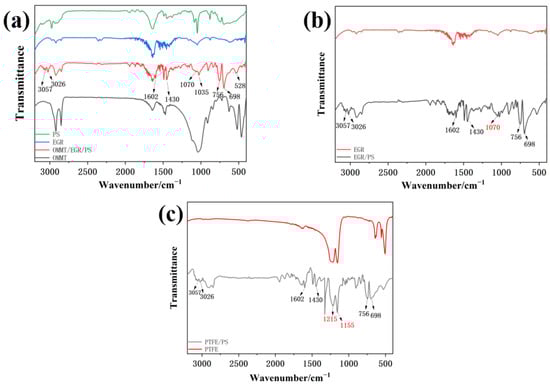 FTIR spectra of (a) OMMT/EGR/PS and PS, (b) EGR/PS, (c) PTFE/PS.