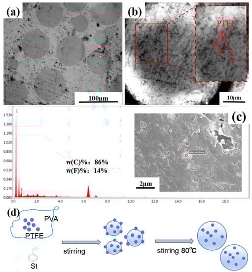 SEM and EDS analyses confirm the hypotheses. Figure 5c gives the SEM image of samples after corrosion. EDS analysis was carried out after the amplification of the white powdered particles, and the results show the existence of elemental F. The presence of F proves that these white-powdered particles are PTFE not corroded by acetone. The formation process of the composite microspheres is shown in Figure 5d. The St monomer was dispersed into tiny droplets under stirring and the effect of dispersing agent. The PTFE particles were dispersed in the PVA dispersant solution. As the reaction progressed, they were enclosed in the St droplets or adhered on the surface of tiny droplets. These small droplets gradually aggregated into large droplets, forming PTFE/PS in which PTFE was dispersed.