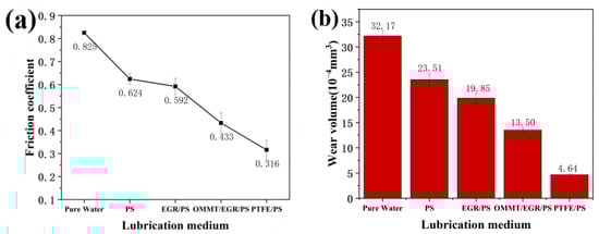 - Compared with pure water, PS, OMMT/EGR/PS, EGR/PS and PTFE/PS all improved the lubrication and wear resistance. PTFE/PS has the best lubricating and anti-wear properties, which can effectively reduce the friction coefficient and reduce the wear volume. Under a load of 10 N, the friction coefficient of PTFE/PS was about 62% lower than that of pure water, and the wear volume was 86% lower than that of pure water.
