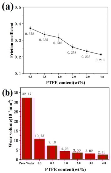 - Increasing the PTFE content can improve the lubricating properties of PTFE/PS. PTFE/PS with 4.0 wt% PTFE addition can reduce the friction coefficient from 0.825 to 0.213, which is nearly 74% lower than that of pure water, and the wear volume of PTFE/PS with 4.0 wt% PTFE is 92.4% lower than that of pure water.