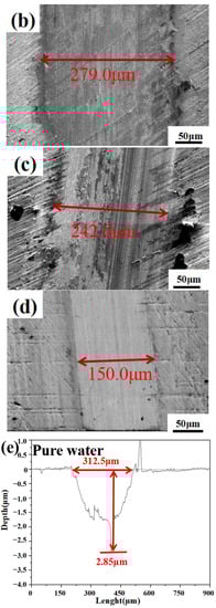 The roughness of wear track with pure water is about 197.00 nm, the width of the wear track is about 312.5 μm and the depth is 2.85 μm. This is a typical adhesive wear and furrow characteristic caused by silicon nitride balls. Large amounts of wear debris accumulated on both sides of the mark, forming abrasive wear and aggravating the wear volume.