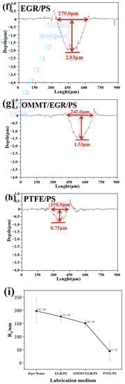 The lubrication mechanism of composite microspheres was studied. Figure 8a–d show the wear tracks morphology of stainless-steel substrates with composite microspheres and pure water. It can be seen that the wear track of pure water is the widest and worst. Among the composite microspheres, the widest is the EGR/PS and the narrowest is the PTFE/PS. Figure 8e–h show the 2D scan image of each wear track. The 2D scan image of the wear tracks can correspond to the width of the wear tracks in the SEM image. The roughness of each wear track is shown in Figure 8i.
