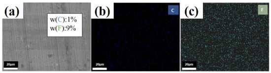 Figure 9 shows the EDS analysis of wear track surface after sliding with PTFE/PS. Figure 9b,c show that there are two main elements, C and F, on the surface of wear tracks, and each element is uniformly distributed over the whole surface. Combined with the friction and wear test results (Figure 6 and Figure 7), it can be considered that PTFE/PS formed a protective transfer film on the substrate surface during the friction test [23]. Transfer film [24] effectively reduces the friction between the silicon nitride balls and stainless-steel substrate. As reported by relevant research, when polymer composites slide against metal counterparts [25], the transfer film has an essential influence on reducing friction and wear, playing a significant role in lubrication, so the PTFE/PS has excellent low friction coefficient and high wear resistance properties.