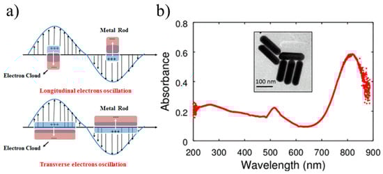 (1) Physical properties: The optical properties, such as scattering and extinction, of metallic particles attributed to surface plasmon resonance (SPR) were theorized by Mie’s significant contribution in 1908. According to Mie’s work [38], the total cross-section for SPR scattering and absorption is the sum of all electromagnetic oscillations, and appropriate boundary conditions were introduced to describe the SPR phenomenon by solving Maxwell equations. Furthermore, it was pointed out that spherical particles exhibit plasmon resonance, which is due to dipole oscillations of free electrons occupying energy states above the Fermi level in the conduction band. Additionally, these NPs demonstrate various colors, which are due to the different sizes, shapes and kinds of NPs, leading to different absorption characteristics. Figure 1 shows a schematic diagram of LSPR excited by spherical gold NPs, for which only one absorption peak exists, while two pronounced peaks are shown for gold nanorods (NRs), as illustrated in Figure 2. This is due to the longitudinal and transverse plasma bands, which are ascribed to the long- and short-axis oscillation of NRs. Numerous reports have linked the spectral properties of NPs to Mie’s theory, which provided support for the development of metallic band structures, and the optical spectral characteristics of NMNPs have continued to be a hot research topic.